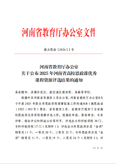近日,河南省教育厅下发了《关于公布河南省高校思政课优秀课程资源评选结果的通知》(教办思政〔2025〕27号),我校在此次评选活动中喜获佳绩。