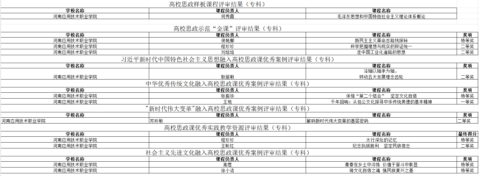 何秀霞负责的“毛泽东思想和中国特色社会主义理论体系概论”课程团队获批高校思政样板课程;侯艳娜获高校思政示范“金课”特等奖,刘培培、程珍珍获高校思政示范“金课”二等奖;耿丽敏获习近平新时代中国特色社会主义思想融入高校思政课优秀案例二等奖;张振华获中国传统文化融入高校思政课优秀案例特等奖,王地获中国传统文化融入高校思政课优秀案例一等奖;苏玲敏获“新时代伟大变革”融入高校思政课优秀案例二等奖;程珍珍获高校思政课优秀实践教学资源特等奖,王盼红获高校思政课优秀实践教学资源二等奖;高煜、徐小洁获社会主义先进文化融入高校思政课优秀案例特等奖。