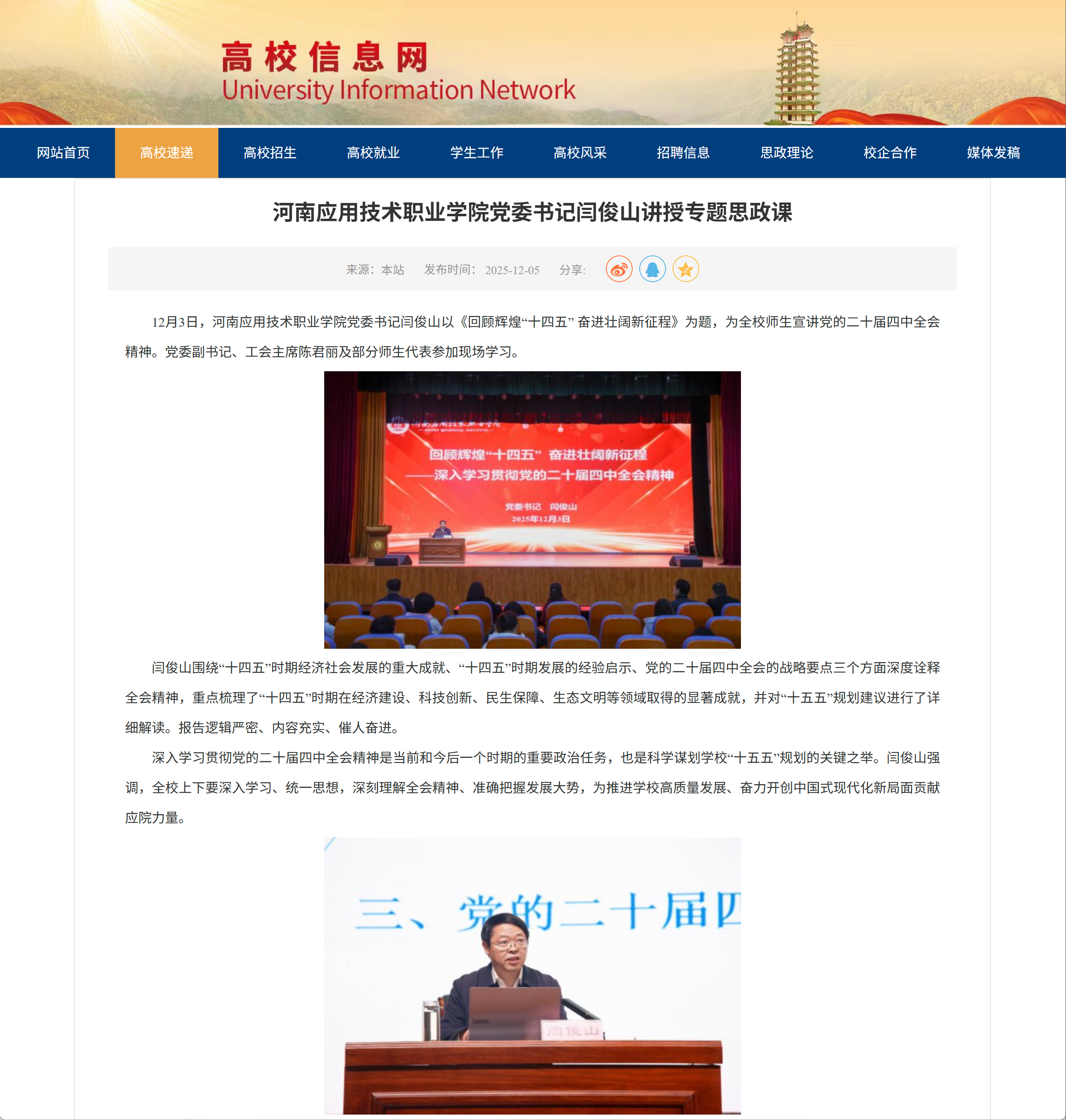 高校信息网:河南应用技术职业学院党委书记闫俊山讲授专题思政课-高校速递-高校信息网