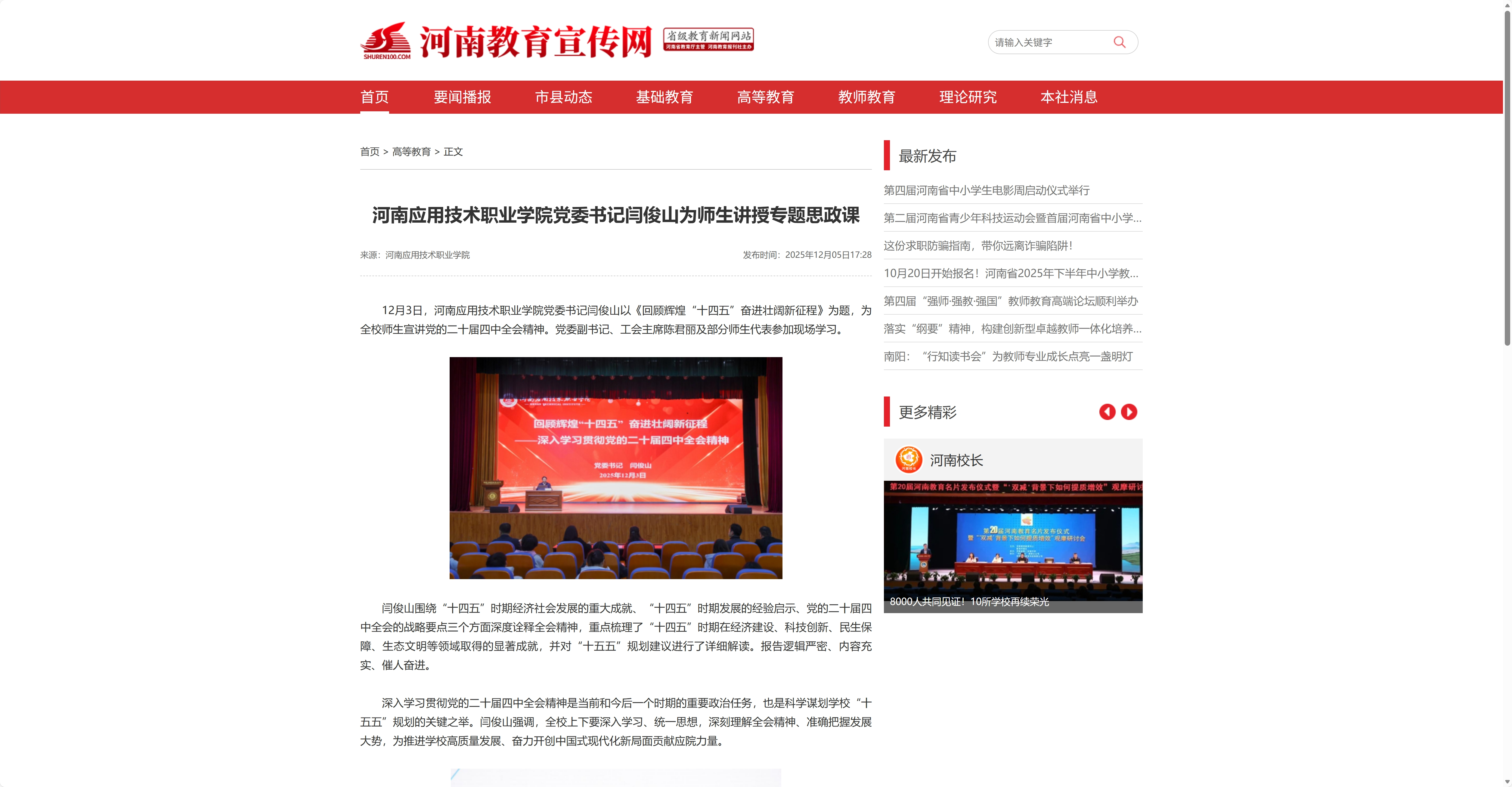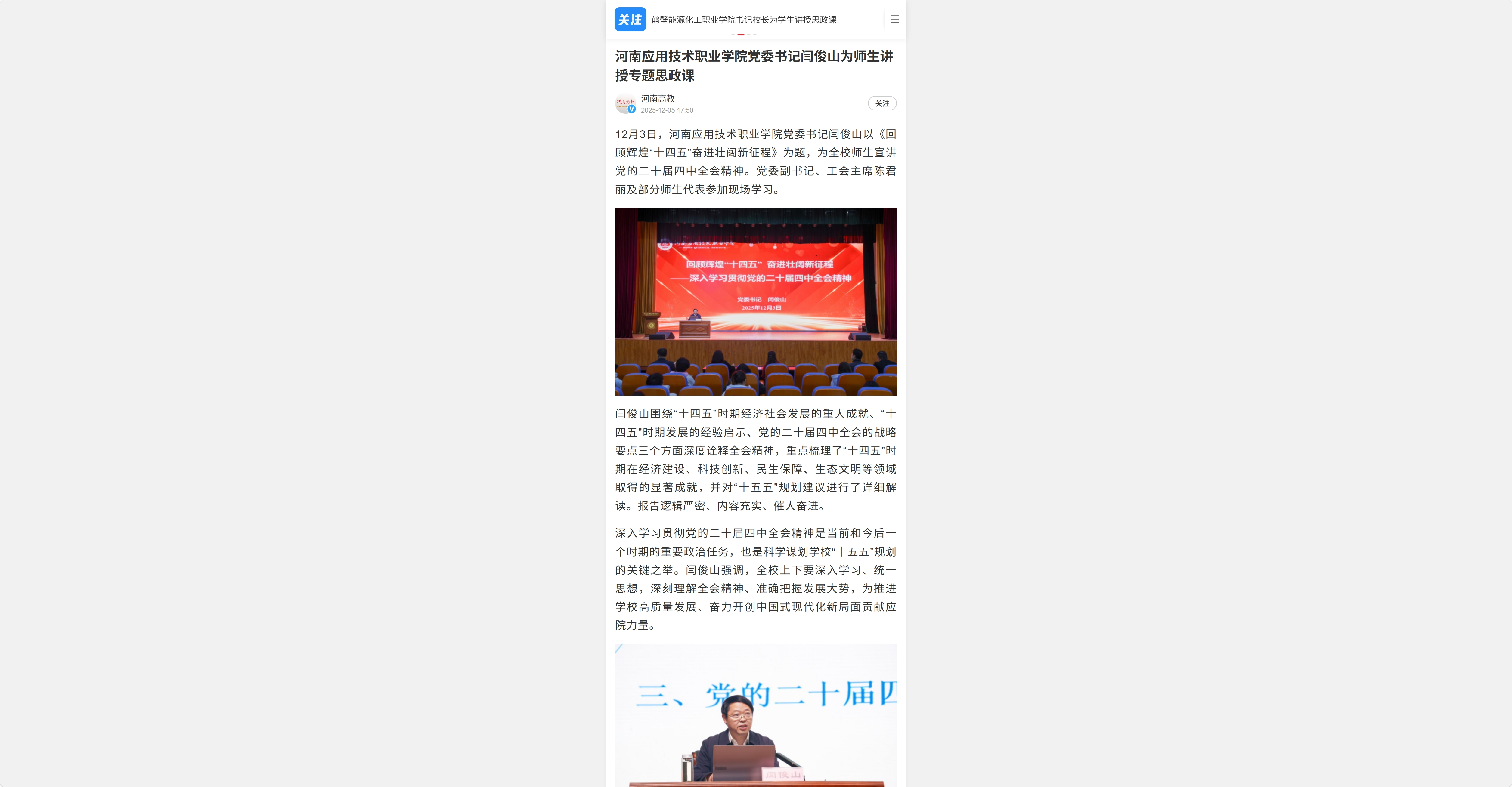河南教育宣传网:河南应用技术职业学院党委书记闫俊山为师生讲授专题思政课_河南教育宣传网-省级教育新闻网站